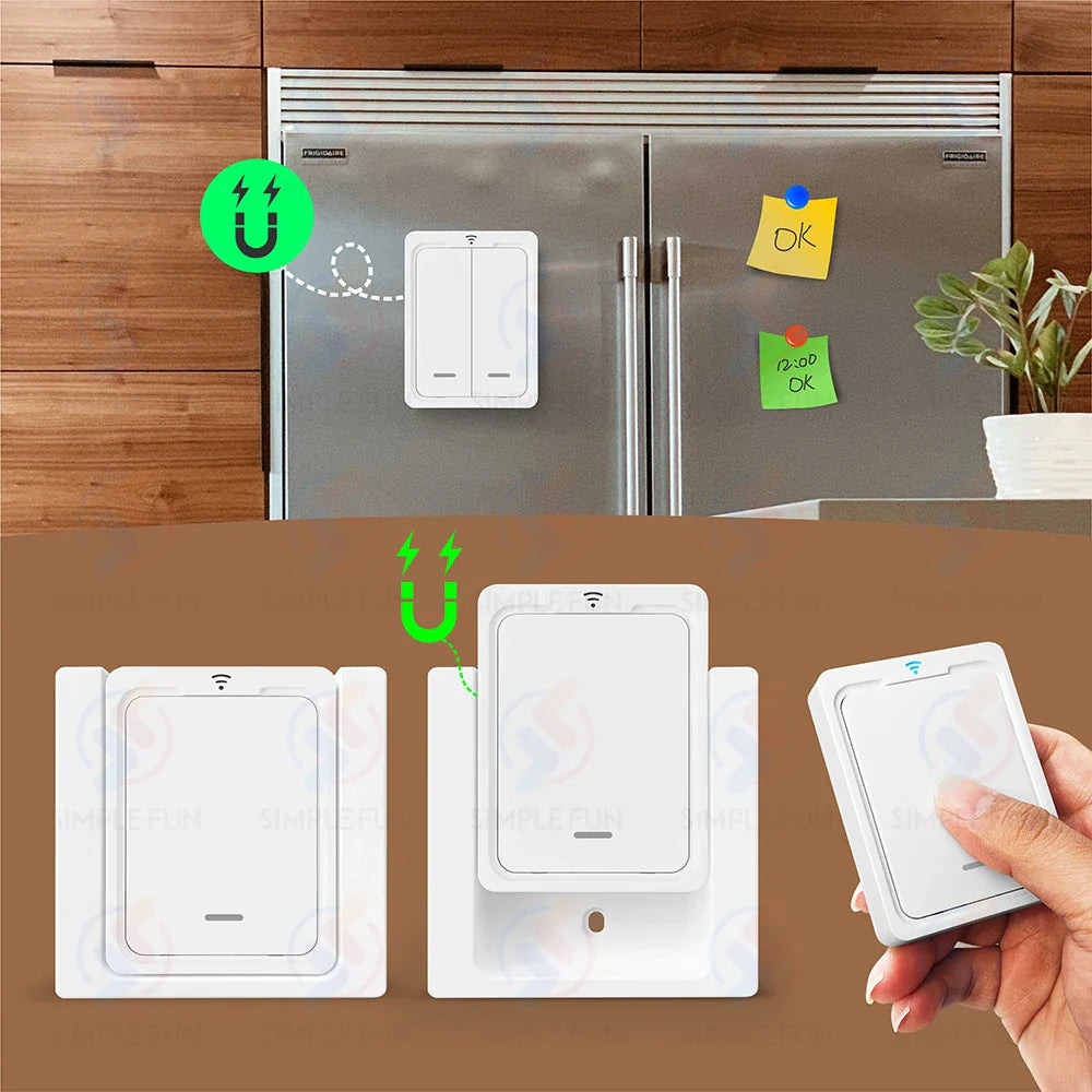 The panel switch can be detached from the base and turned into a remote control, making it convenient for the elderly and children to use. The panel can be magnetically attached to the base or to a metal object, such as a refrigerator door. The base can be attached to the wall using double-sided tape (included) or screws (included).
