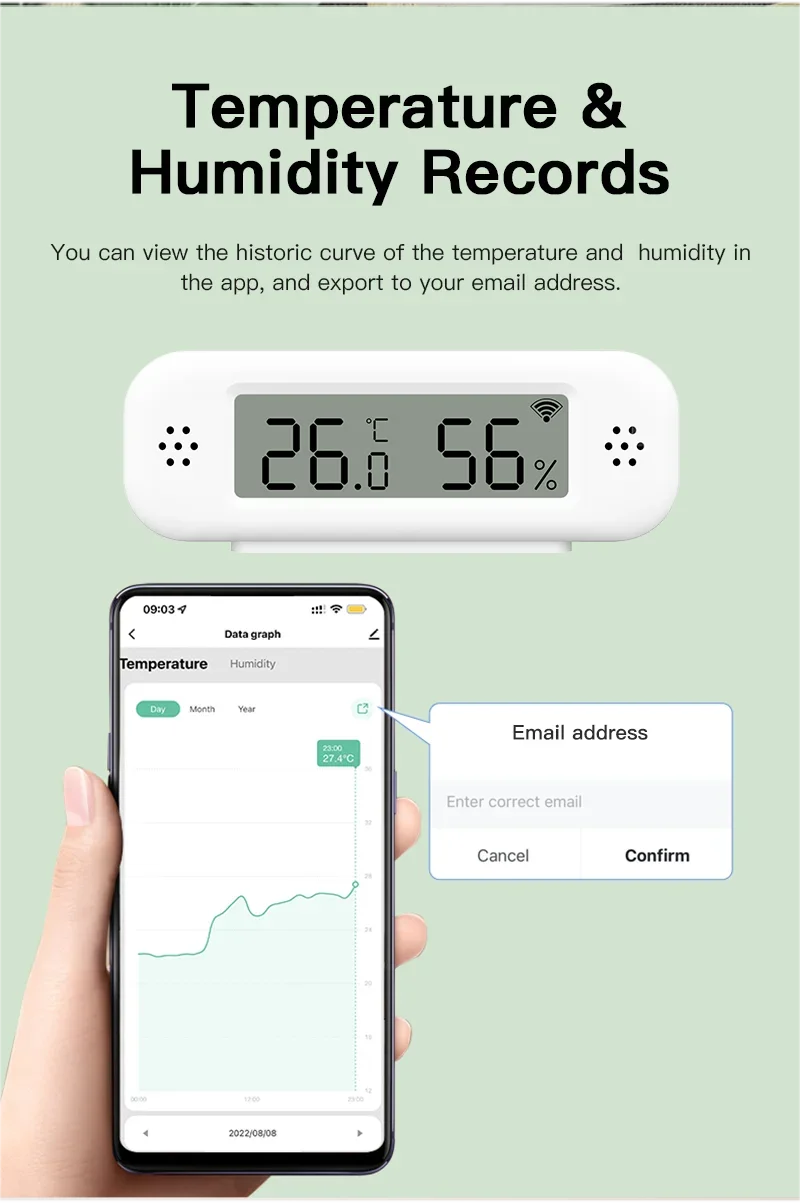 You can view the historic curve of the temperature and humidity in the app, and export to your email address.