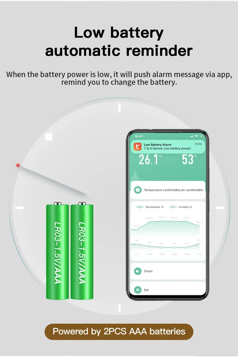 When the battery power is low, it will push alarm message via app, remind you to change the battery.