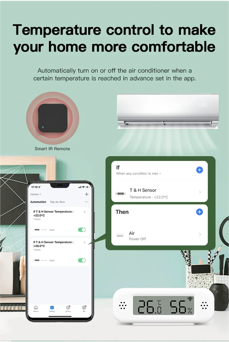 High-precision and real-time monitoring help you complete different linkage strategies. For example, if the temperature reaches 32.6 degrees Celsius, than turn on the air conditioner through our universal remote control. Or turn on the humidifier when the humidity is less than a certain value.