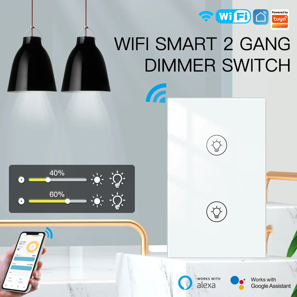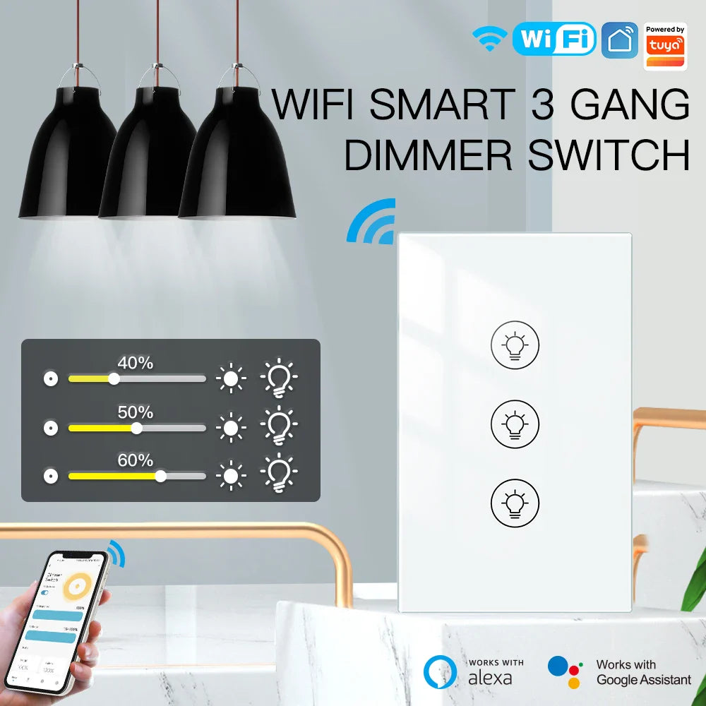 The MOES Tuya WiFi Multi-gang Smart Light Dimmer Switch allows you to control multiple lights with adjustable brightness. Compatible with the Tuya Smart Life app, it supports 1, 2, or 3 gang configurations and integrates with Alexa and Google Voice Assistants for convenient voice control.