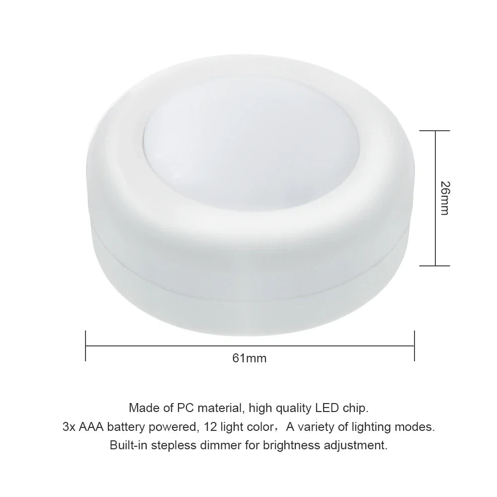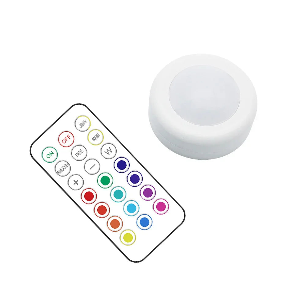 Enhance your space with Wireless LED Puck Lights. Featuring 13 colors, remote control, and dimmable options, these RGBW lights are perfect for cabinets, wardrobes, stairs, hallways, and night lighting.