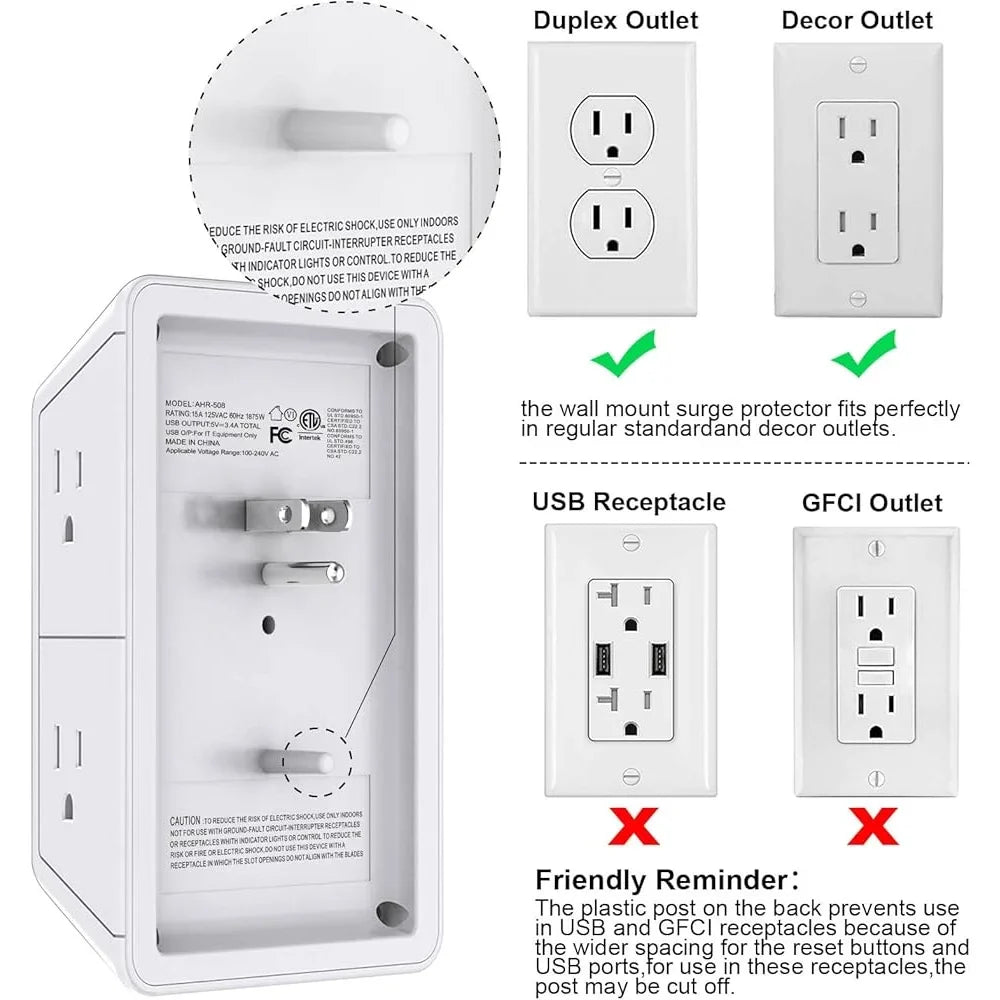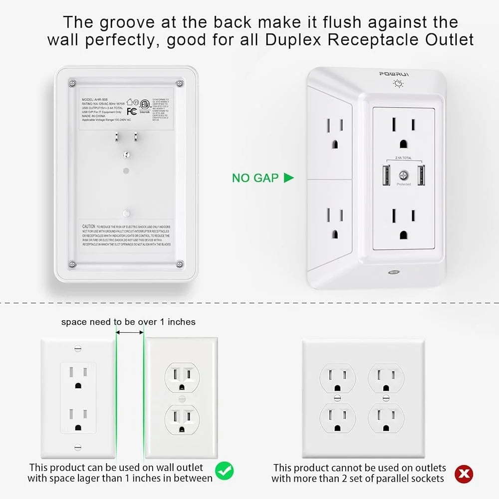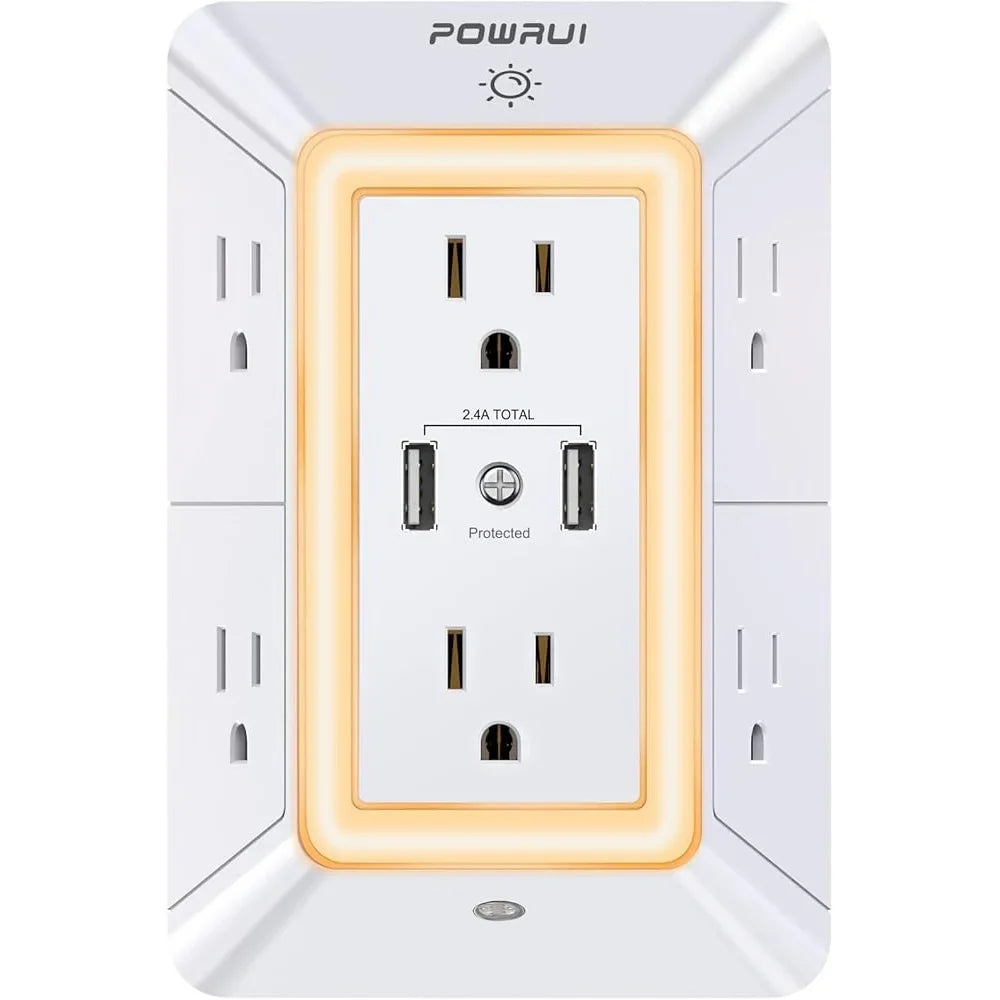 This 3-sided wall outlet extender features 6 AC outlets, 2 USB charging ports, and a built-in night light, offering safe and convenient charging for all your devices. With 1680J surge protection, it’s ideal for home, office, or travel use.