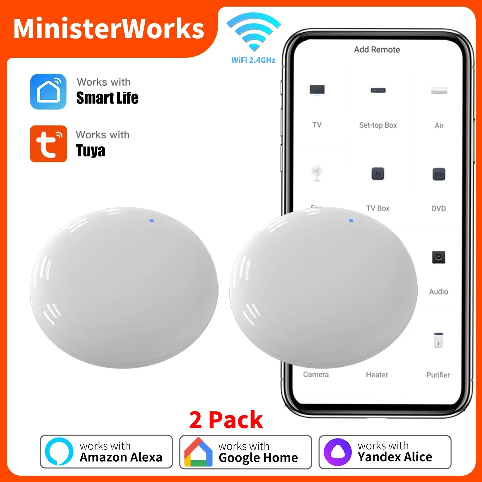 Control your home appliances seamlessly with the 2PACK Tuya WiFi IR Remote. This smart universal remote for your TV, DVD, AC, and more works with Alexa, Google Home, and Yandex Alice, offering convenient remote control and voice integration for smart home automation.