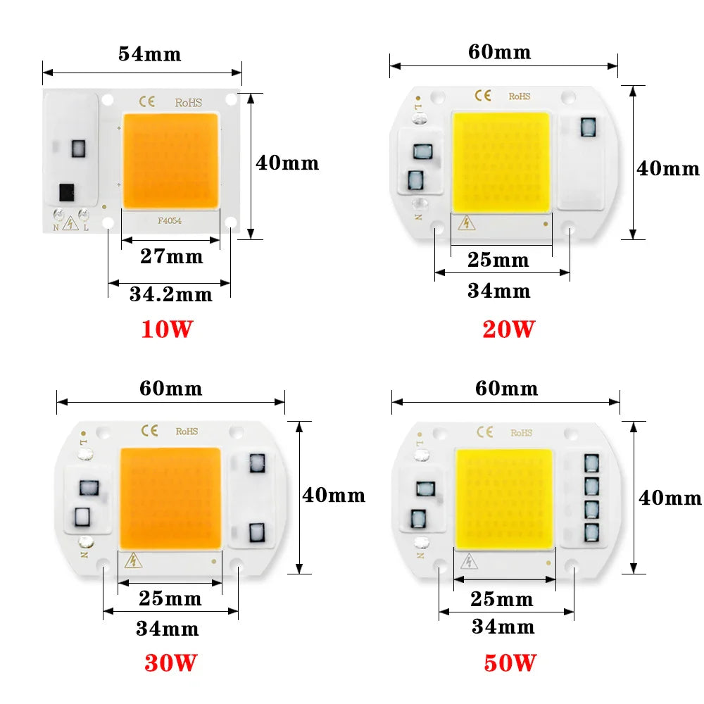 Power up your lighting projects with this efficient COB chip LED lamp. Available in 10W, 20W, 30W, and 50W, featuring smart IC technology—no external driver needed, perfect for floodlights, spotlights, and DIY lighting.
