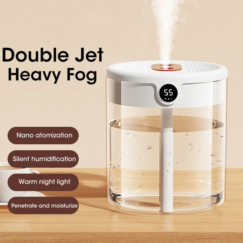 Keep your bedroom fresh and comfortable with the Niye 2L Double Nozzle Air Humidifier. Featuring a large capacity, dual nozzles for wider mist coverage, and an LCD humidity display, it also doubles as an essential oil diffuser for a soothing atmosphere.