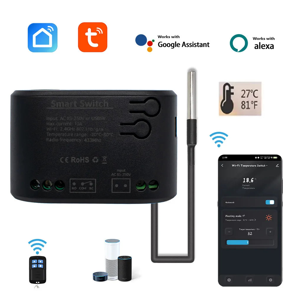 The Tuya Smart Temperature Switch offers passive dry contact WiFi temperature monitoring. Designed for versatile use, it allows for precise temperature control and integrates with Alexa for voice command functionality.